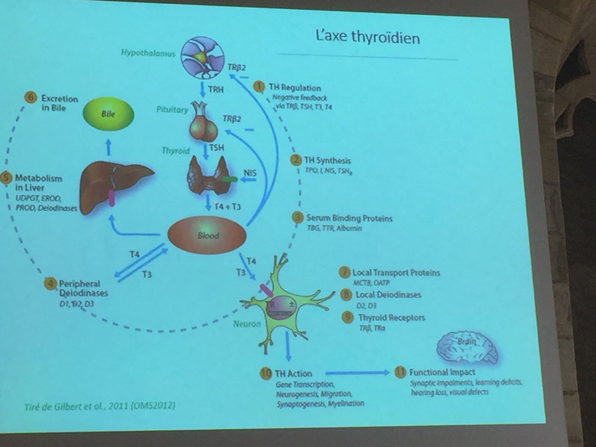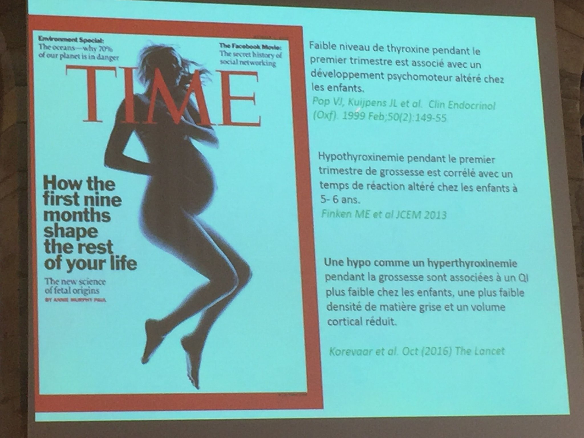 Les malades de la thyroïde (300 millions de personnes dont 3 millions en France) sont bien sûr également touchés par les perturbateurs endocriniens qui influent sur le réglage des glandes, hormones et transporteurs. 8 fois plus chez les femmes mais les hommes, plus difficiles à diagnostiquer, sont touchés. Trop ou pas assez d'hormones thyroïdiennes est néfaste, elles influent sur la totalité de la vie, dès la grossesse pour le développement de l'enfant, avec une modification de la forme du cerveau et des neurones. Les maladies auto-immunes, dont Hashimoto, ont un facteur génétique, mais aussi environnemental par les perturbateurs endocriniens.