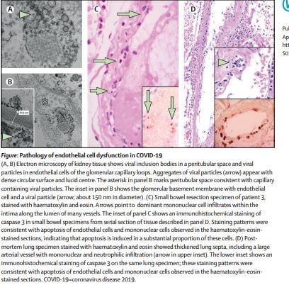Sur le plan anatomopathologique : cette endothélite est évoquée par plusieurs auteurs notamment dans une lettre adressée à "the Lancet" rappelant le rôle des récepteurs de l'angiotensive dans la pathogenèse de l'infection.