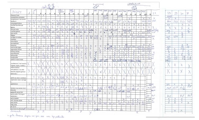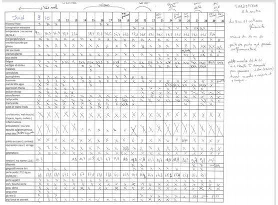 Donc, à force d’être prise pour une folle, tu m’en as fait venir à ma seconde devise JUSTE ET TENACE. J’ai donc décidé de faire autrement puisque personne ne me croyait, que j’étais un OVNI, une qui fait semblant d’être malade comme cela se dit encore. J’ai donc fait des photos de tout, des relevés, des preuves en quelques sortes. Tension, température, bleus, engelures, veines gonflées, tous mes symptômes… Me voilà à faire des tableaux et des photos