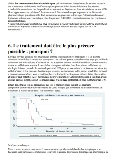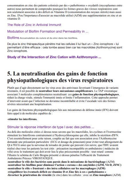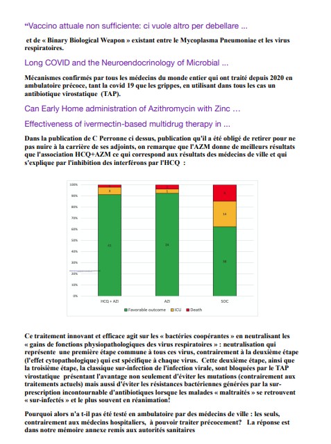 Si les autorités sanitaires n'engagent pas dès réception de ces données, des essais comparatifs RDB, effectués par des médecins de ville (et non par des hospitaliers voyant leurs malades trop tard après la phase virale, en phase inflammatoire, phase dans laquelle le TAP n'est plus efficace), ils pourraient être rendus non seulement responsables de non-assistance à personnes en danger, de dépenses de pognons de « dingue » (hospitalisations et traitements avec des molécules très chères), mais aussi de complicité dans la survenue de résistance bactérienne aux antibiotiques liés aux surinfections qui se multiplient chez les malades non traités en Ambulatoire Précoce virostatique .