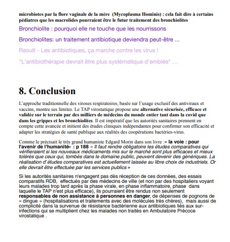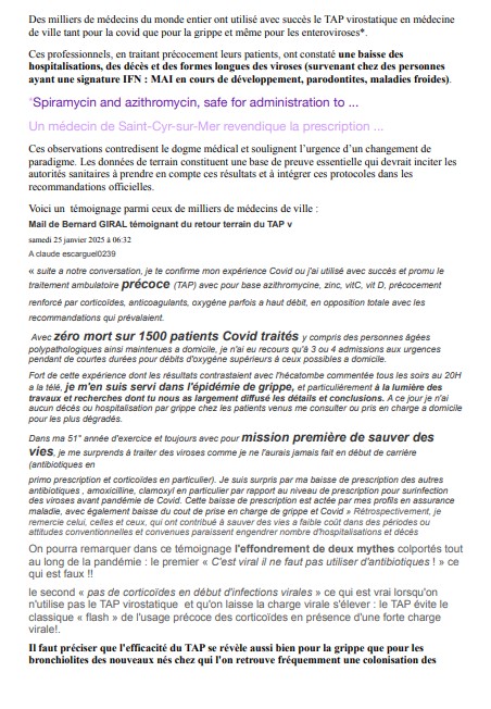 L’approche traditionnelle des viroses respiratoires, basée sur l’usage exclusif des antiviraux et vaccins, montre ses limites. Le TAP virostatique propose une alternative sécurisée, efficace et validée sur le terrain par des milliers de médecins du monde entier tant dans la covid que dans les grippes et les bronchiolites. Il est impératif que les autorités sanitaires prennent en compte cette avancée et initient des études cliniques indépendantes pour confirmer son efficacité et adapter les stratégies de santé publique aux réalités des coopérations bactéries-virus.