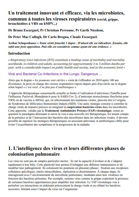 Un traitement innovant et efficace, via les microbiotes, commun à toutes les viroses respiratoires (covid, grippe, bronchiolites à VRS ou hMPV...) Dr Bruno Escarguel, Pr Christian Perronne, Pr Garth Nicolson, Dr Peter Mac Cullogh, Dr Carlo Brogna, Claude Escarguel.